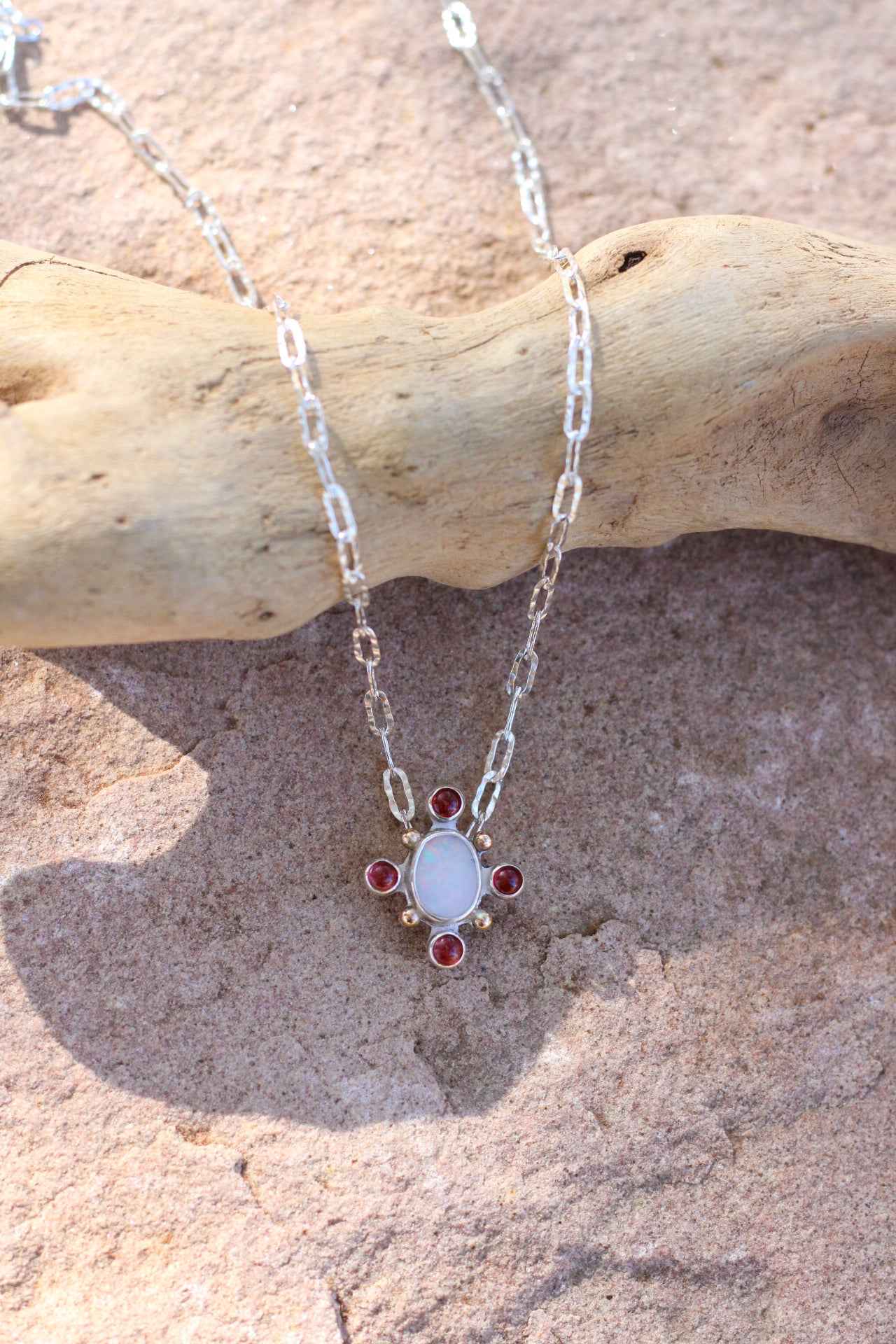 A hand-cut Australian opal takes center stage, its mesmerizing rainbow flashes framed by deep red garnets and warm 10 karat gold. Strung on a textured chain, you can customize the length to suit your style.