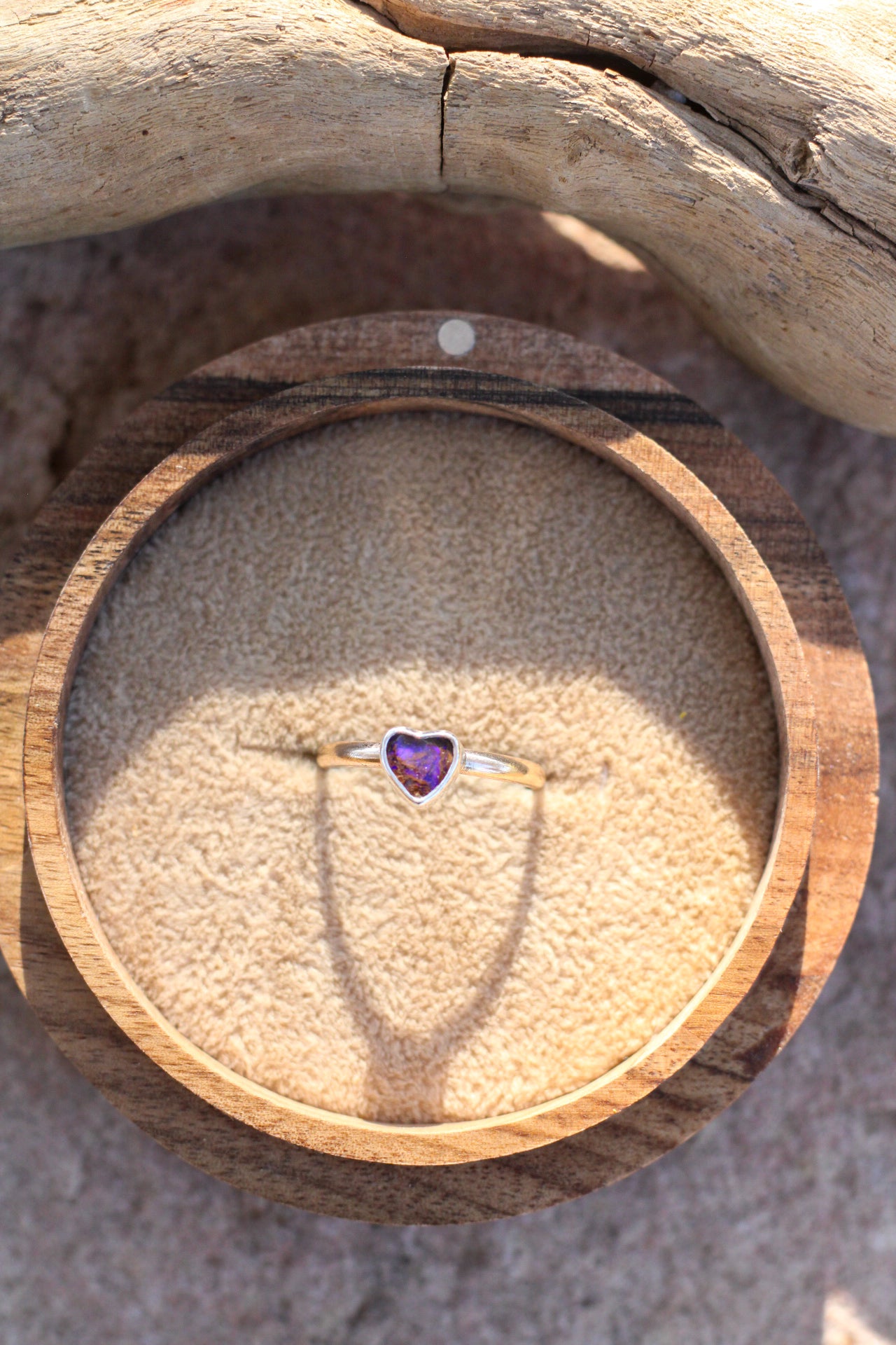 Celebrate eternal love with this heart-shaped Australian boulder opal ring, where purple hues dance across the stone's surface. Nestled on a gold band, this handcrafted piece becomes a wearable declaration of eternal devotion.