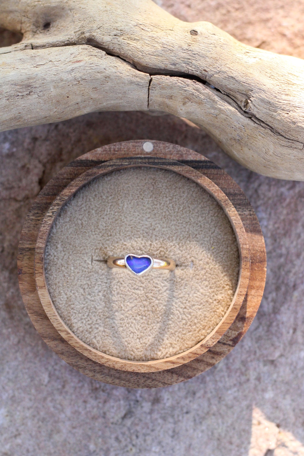 Celebrate eternal love with this heart-shaped Australian boulder opal ring, where purple tones dance across the stone's surface. Nestled on a gold band, this handcrafted piece becomes a wearable declaration of eternal devotion.