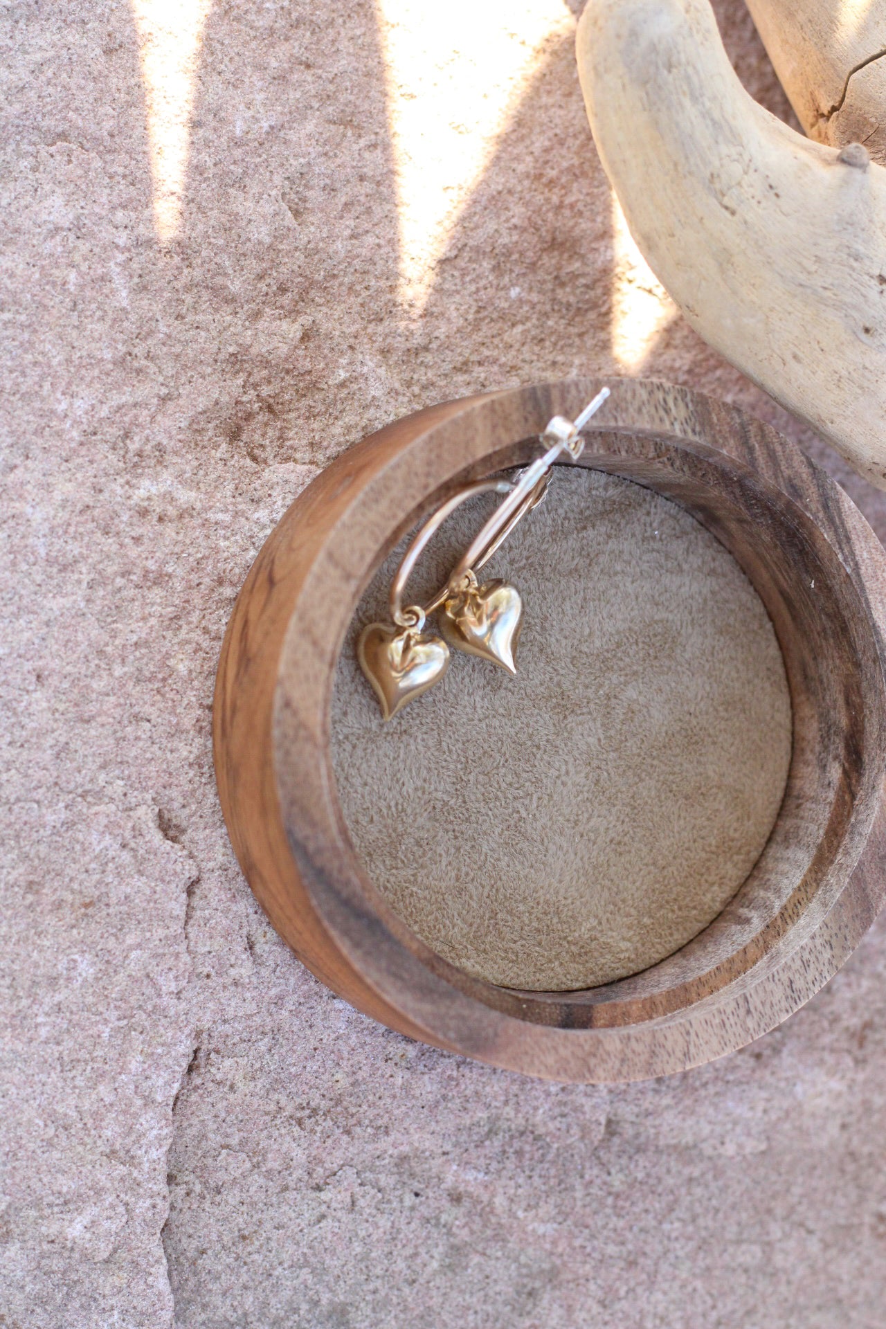 Classic hoops get a sweet twist with gold hearts that dangle playfully with every move. Simple enough for everyday wear, charming enough to make you smile every time you catch your reflection.