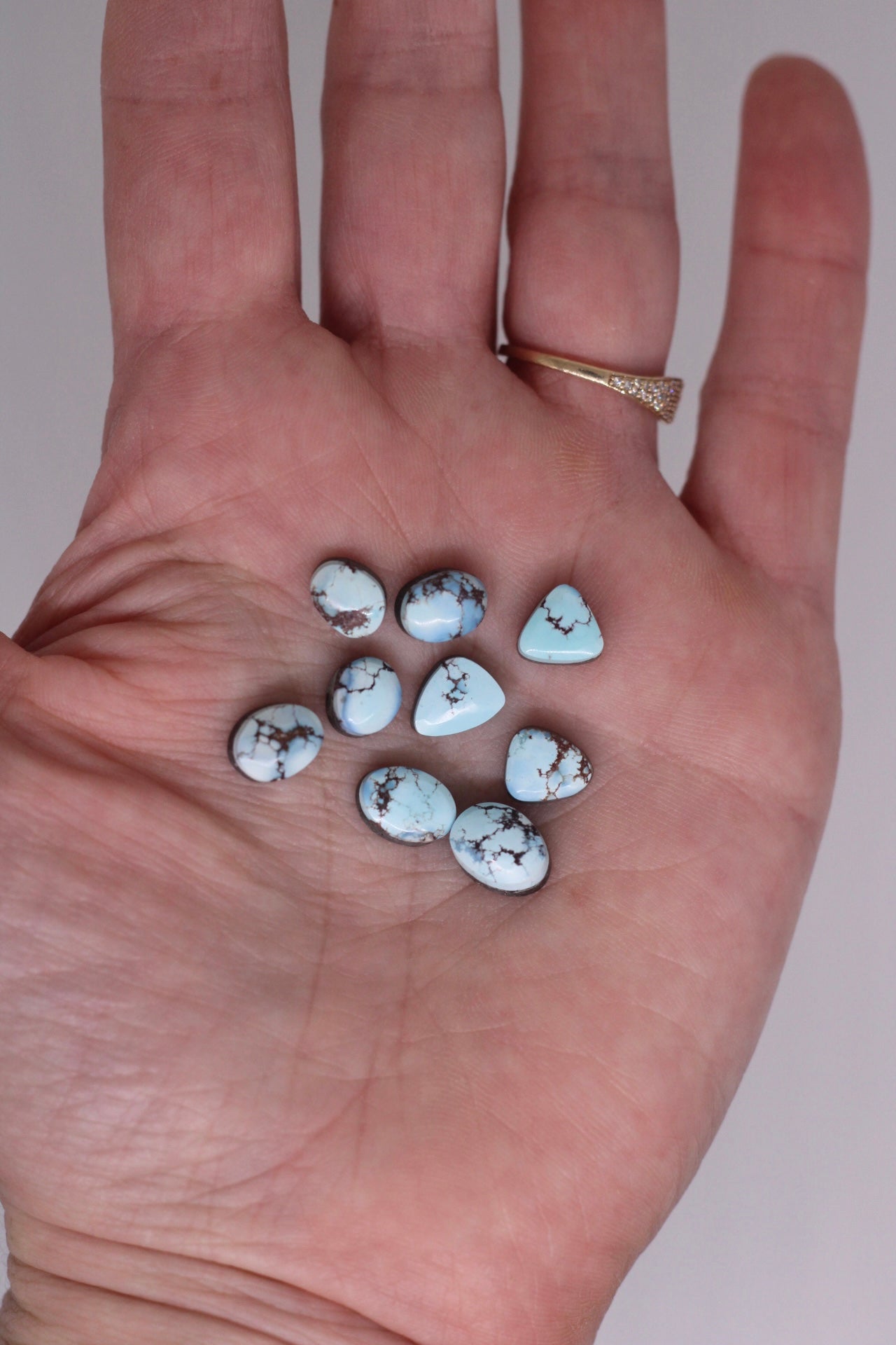 • Load image into Gallery viewer, Hand holding several turquoise stones against a neutral background