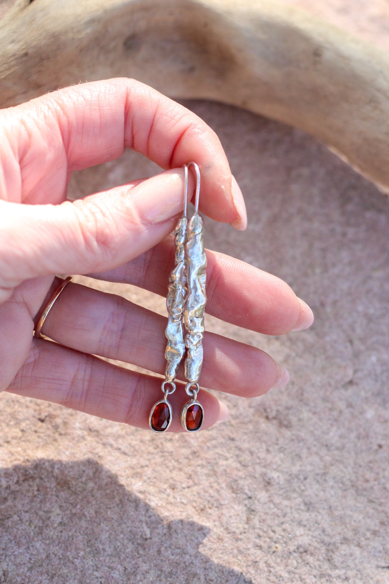 Silver earrings with red stones in a wooden holder on a stone surface