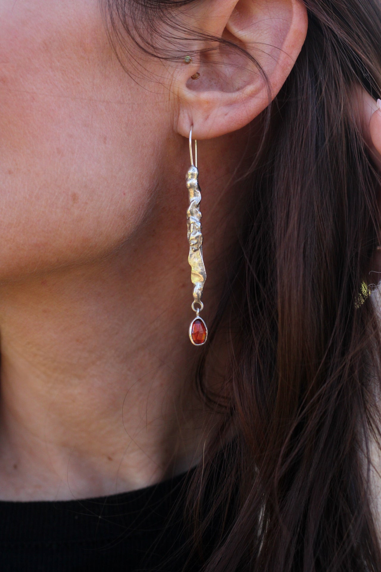 Close-up of a person wearing a silver earring and a red gemstone.