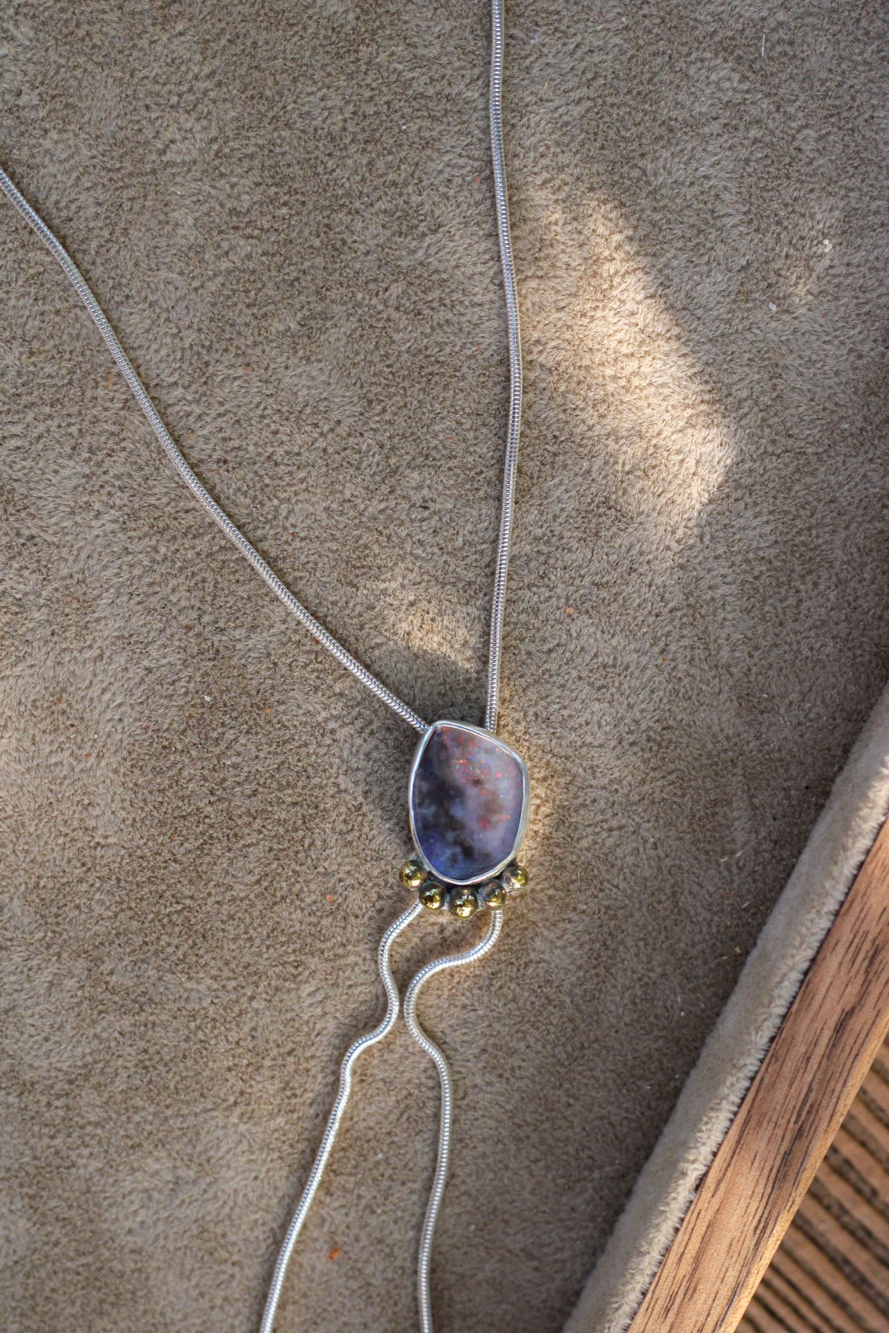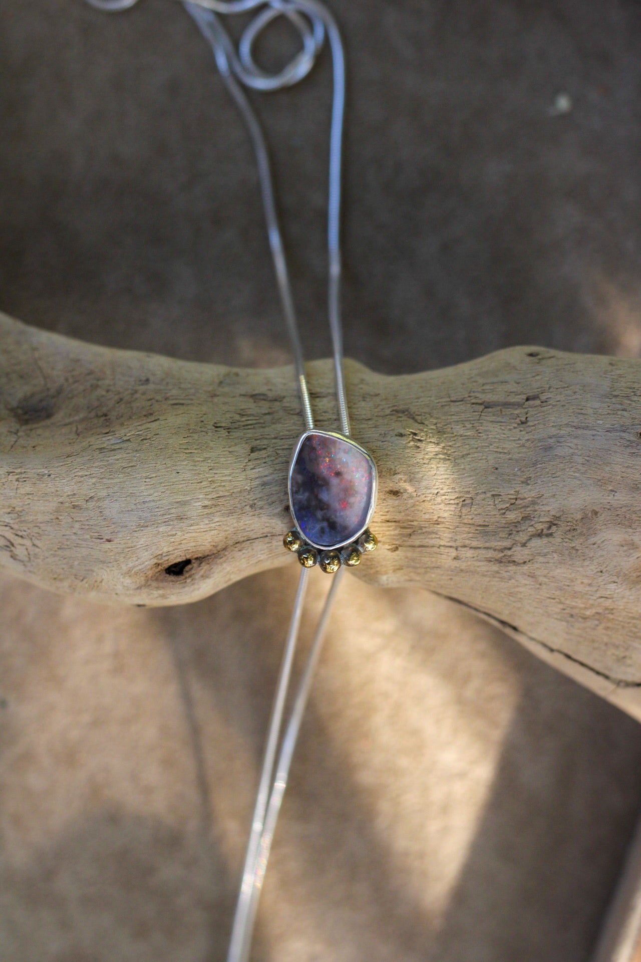 A mesmerizing Australian boulder opal that captures the cosmos, swirling nebulas with blue, green, and violet. Warm gold grounds the piece with brass accents that frame the opal. The adjustable length ensures a perfect fit for anyone