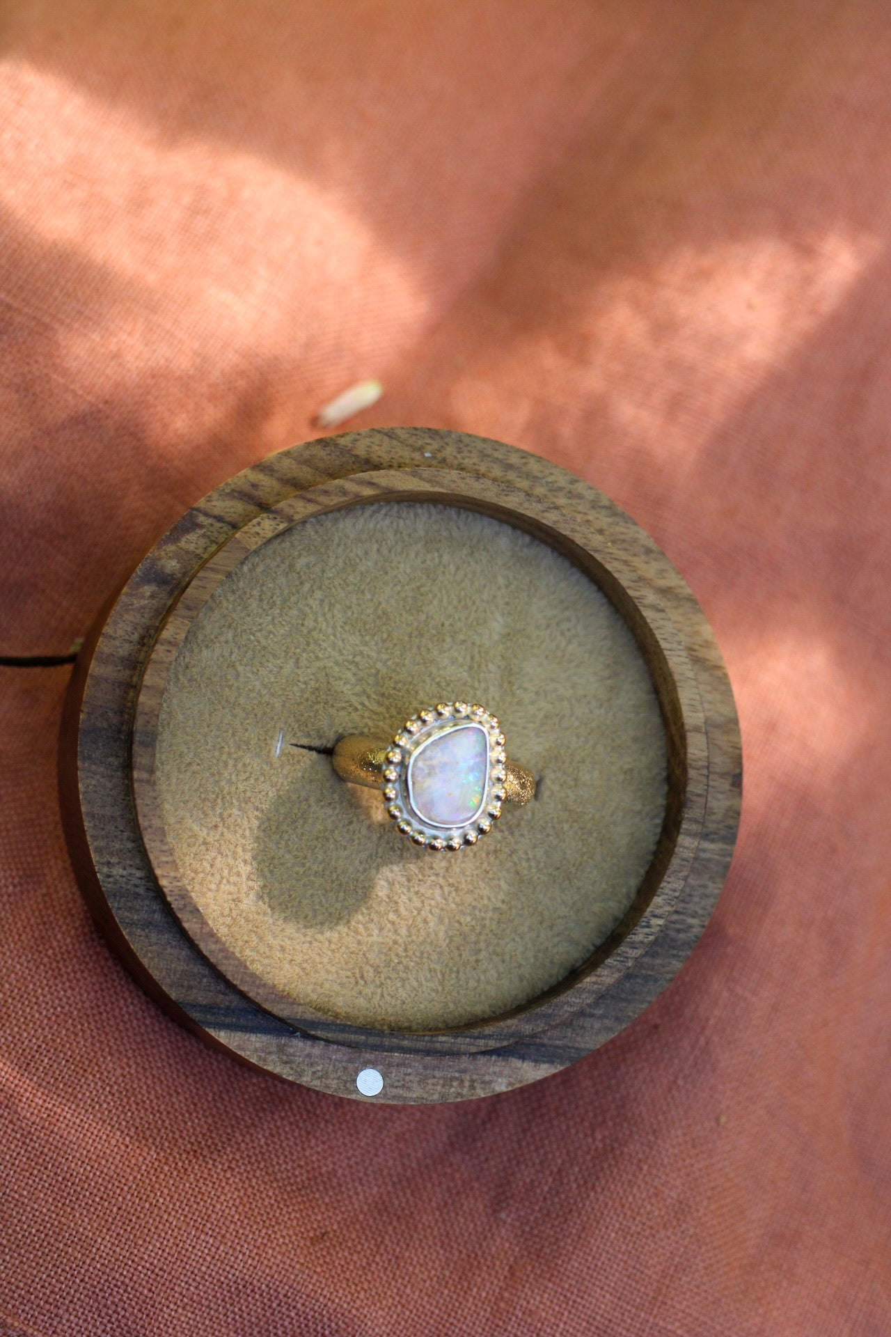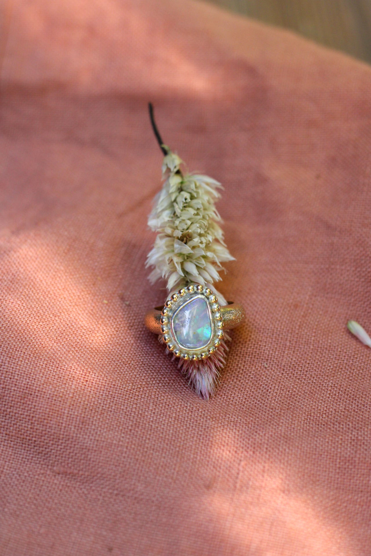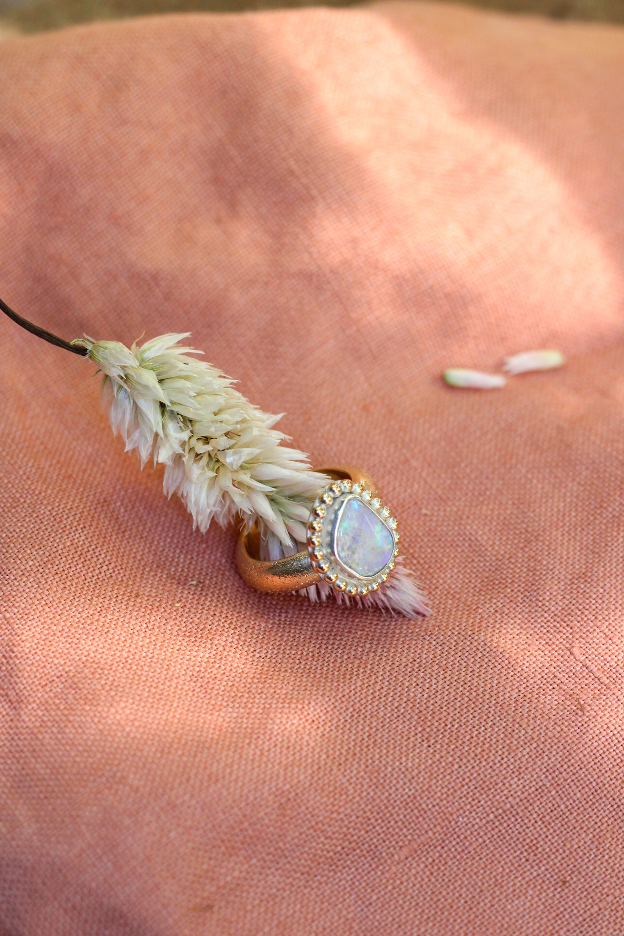 This Australian Boulder Opal Ring enchants with its pastel hues, set delicately inside a beaded frame. The thick golden band, textured by a diamond point, captures light to create a shimmering sparkle, mimicking stardust.