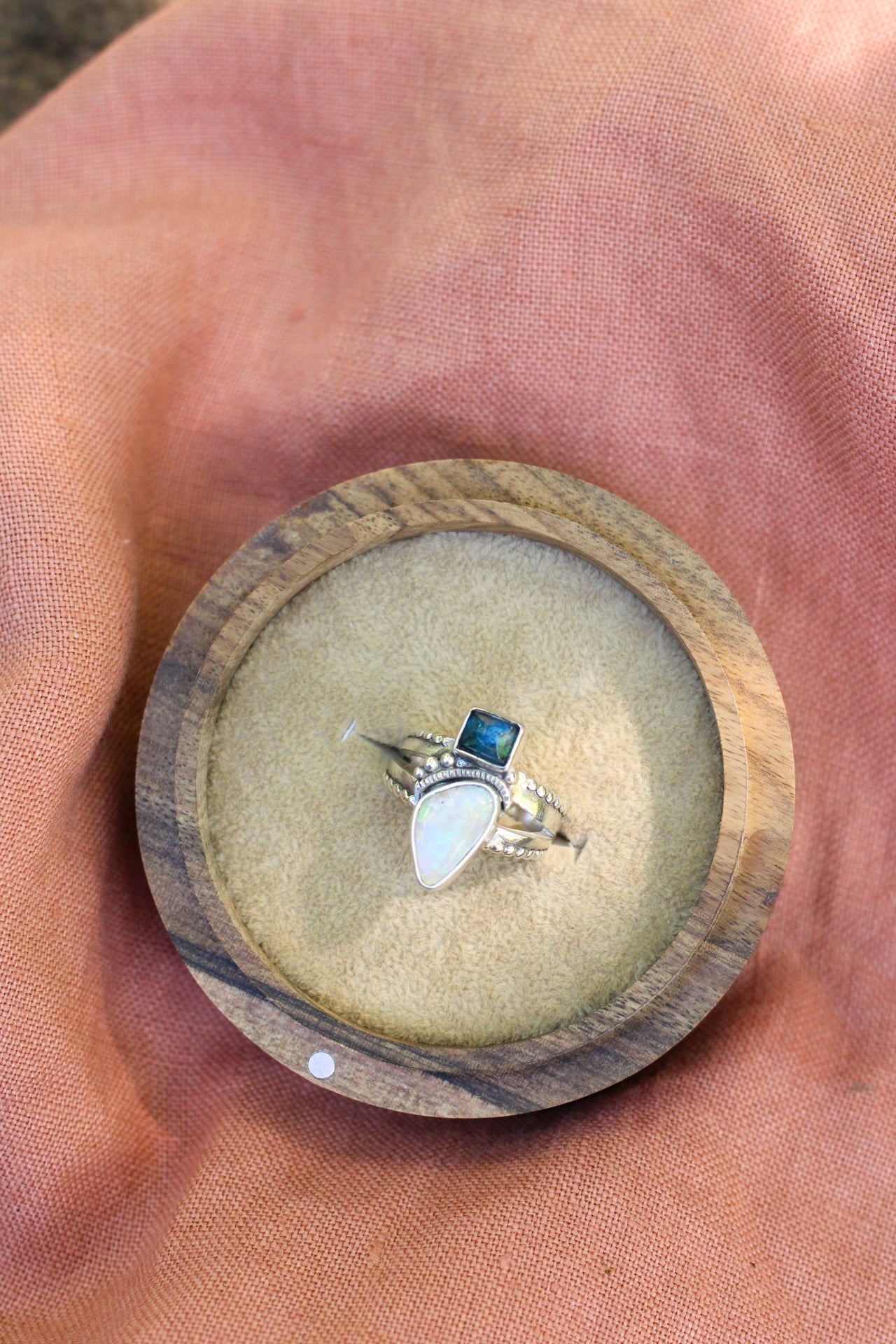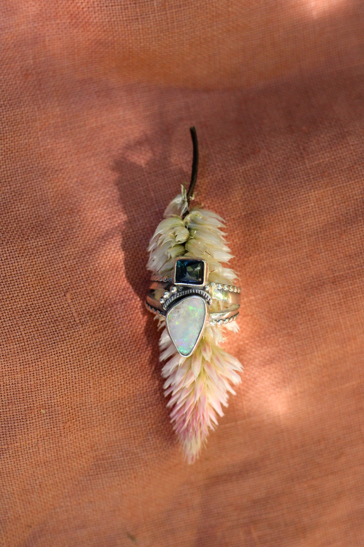 This enchanting ring showcases a blue tourmaline paired with an Australian opal that shimmers in soft rainbow colors. Delicate detailing on the band adds an ethereal touch.