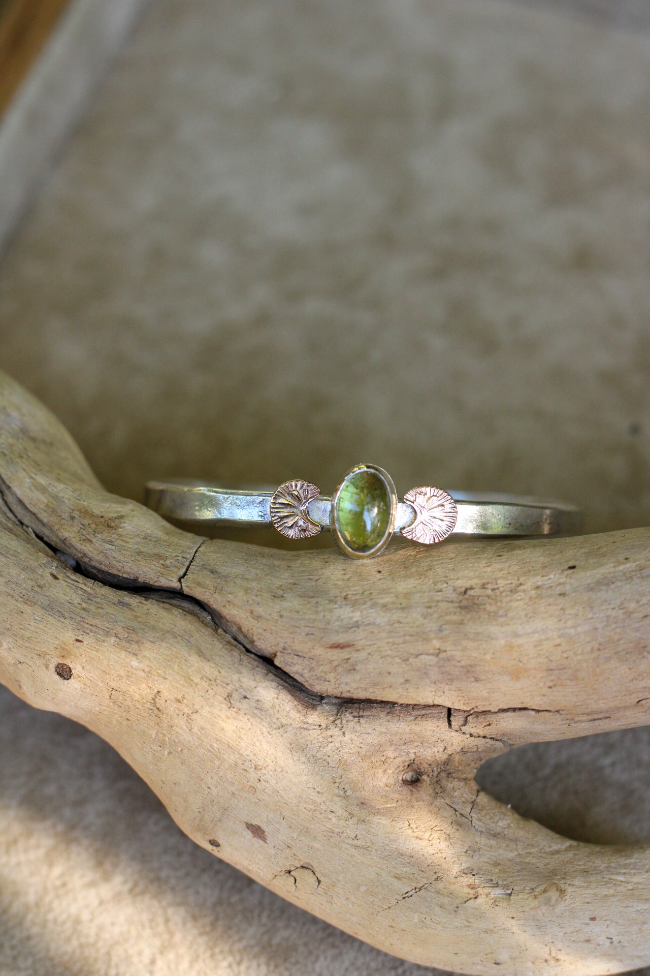 This earthy cat-eye apatite forms a moving line when light reflects off the needle-like inclusions inside the stone, it sits beside two hand-stamped accents. All resting upon a hammered cuff.