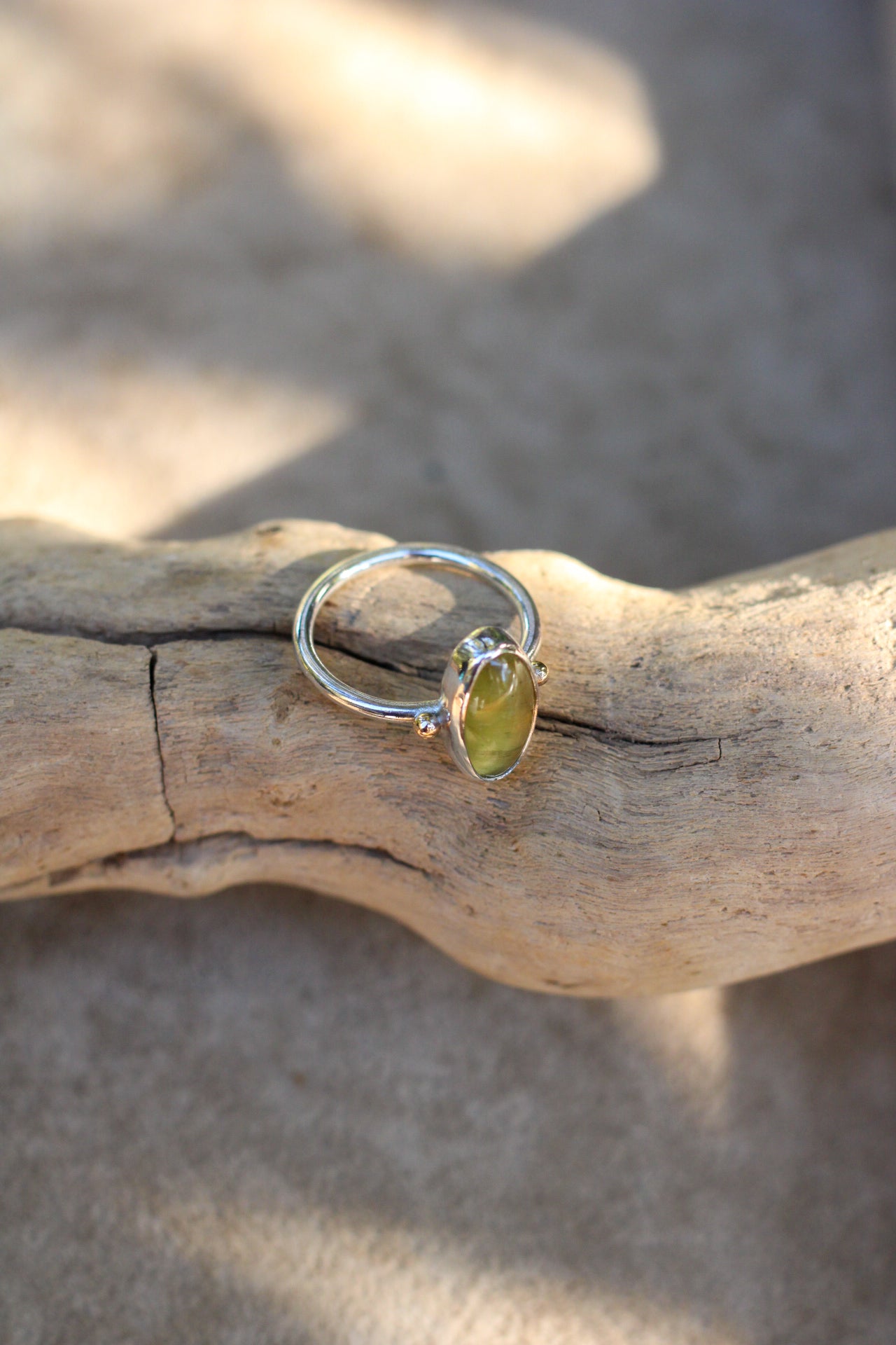 Adorned with an earthy cat-eye apatite, this glowing stone forms a moving line when light reflects off the needle-like inclusions inside the stone. Two delicate 10-karat gold beads flank the stone, set on a simple band.