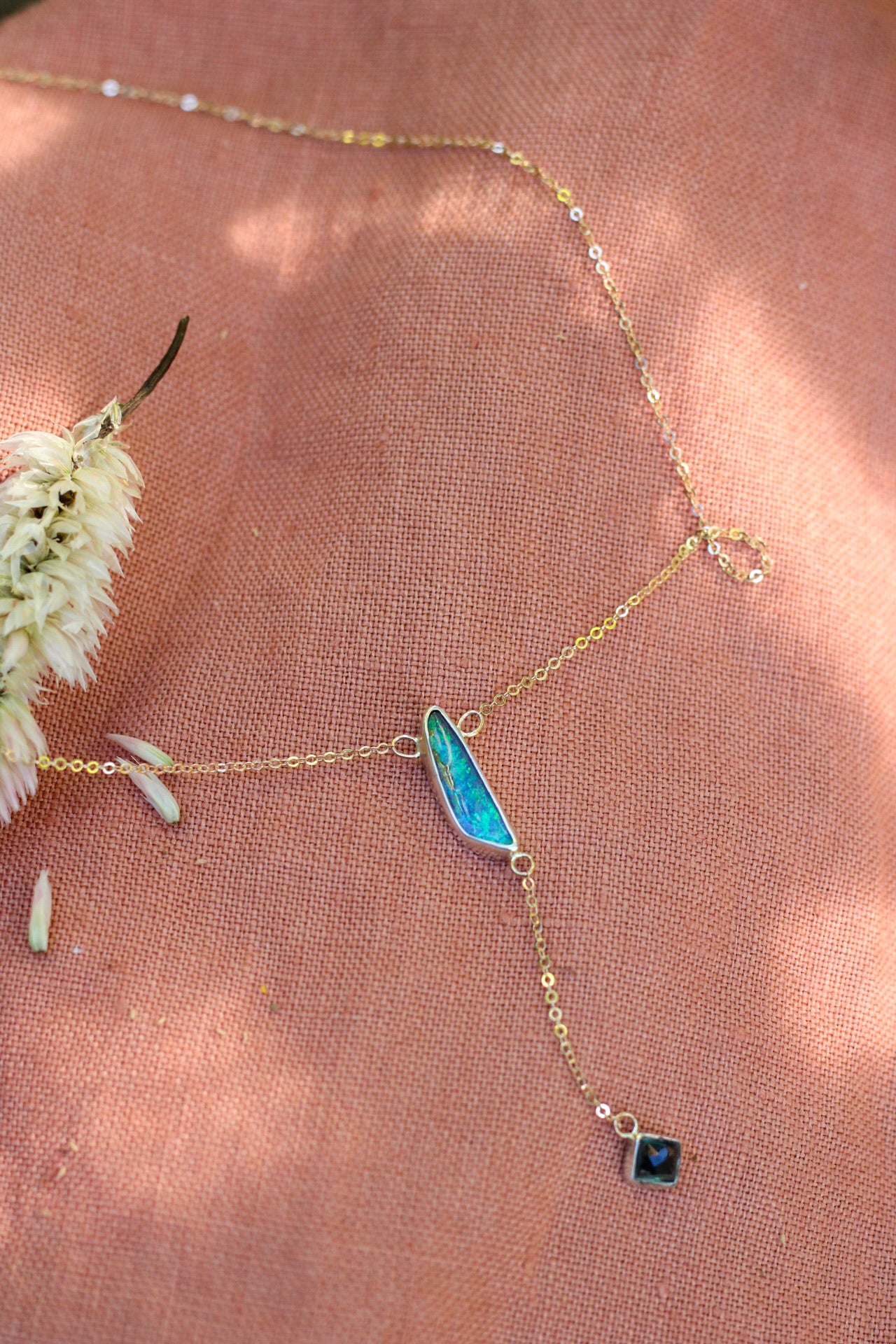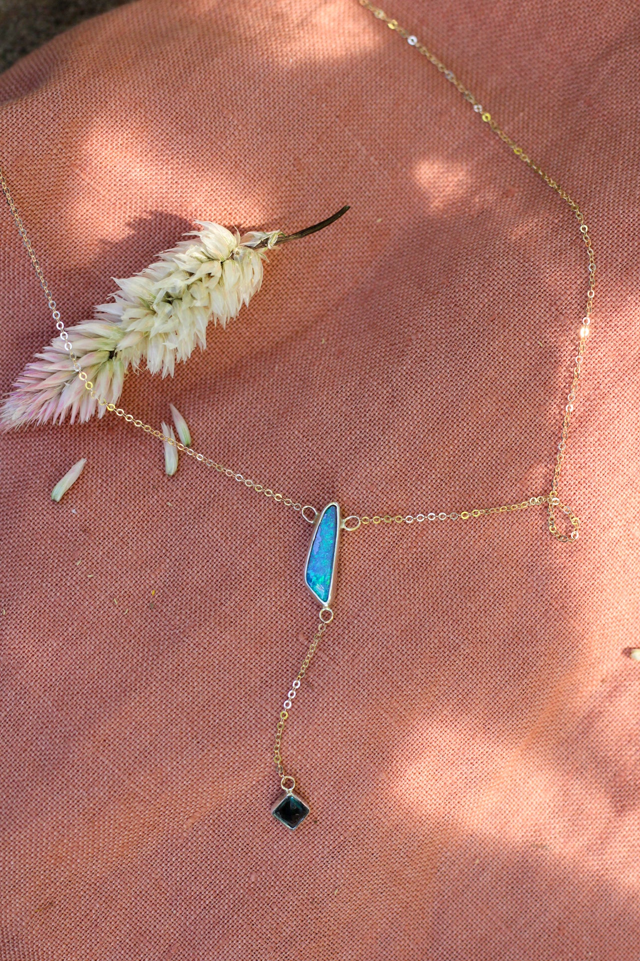 This magical lariat necklace features a radiant ocean-blue Australian boulder opal paired with a delicate tourmaline dangle, creating a captivating dance of color.