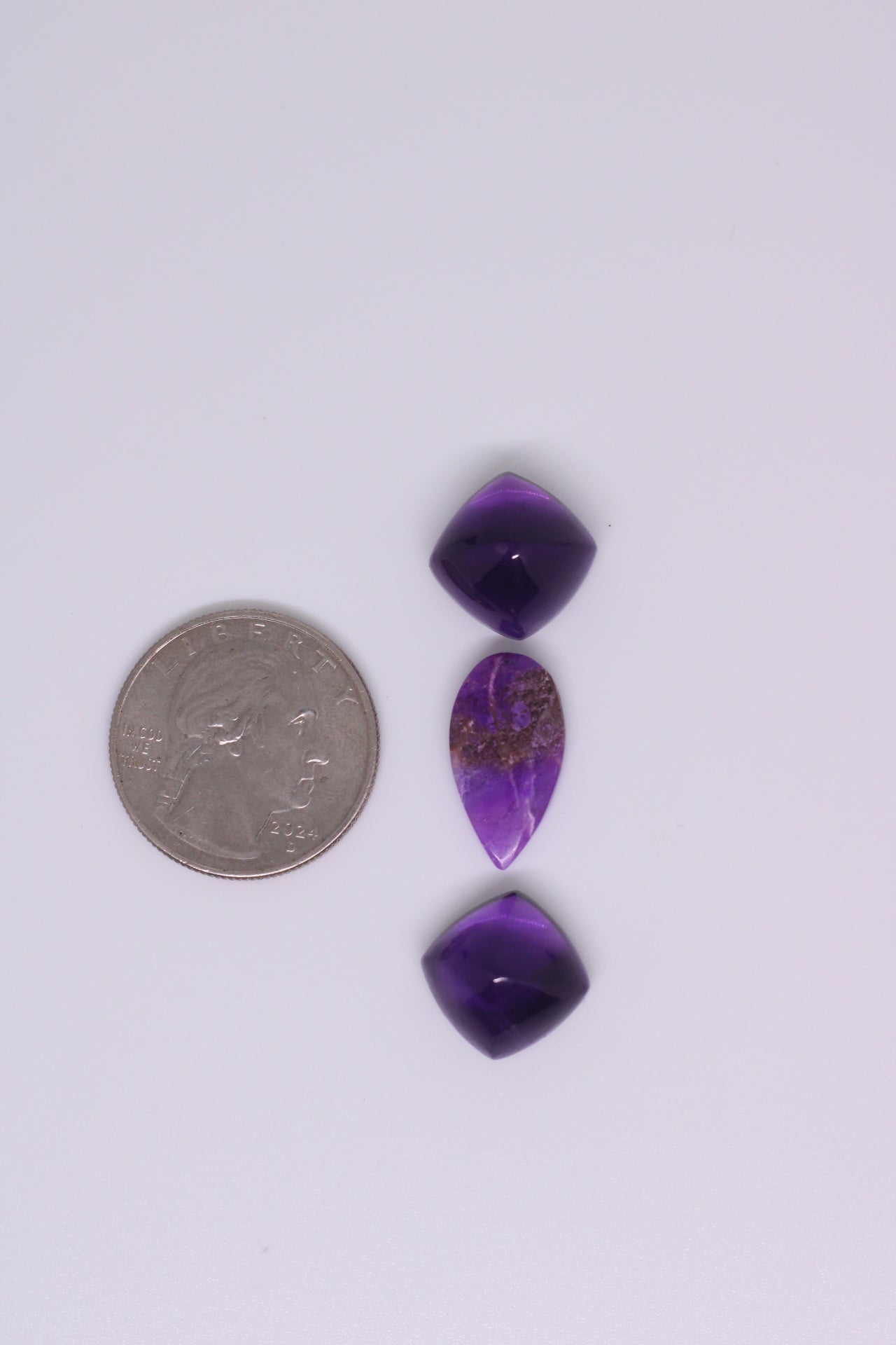 • Load image into Gallery viewer, Three purple gemstones on a gray background with a coin for scale.