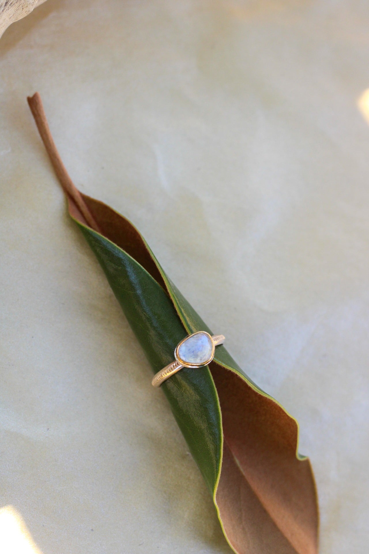 Add a touch of whimsy to your jewelry collection with our Moonstone Ring. This simple and sweet ring stacker can be worn alone for a delicate look or stacked with other rings for more of a statement. Its beautiful glowing color and regal gold make it a must-have.