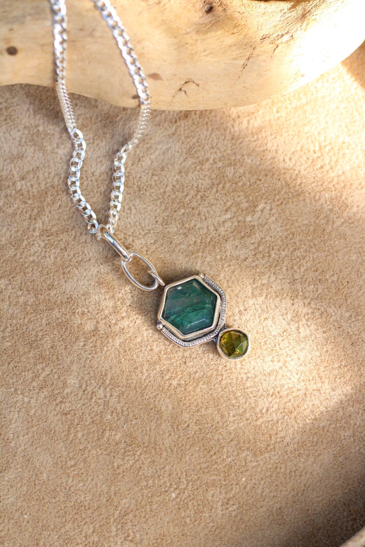 This moss agate embodies nature and organic beauty, while the paired sphene sparkles, flashing orange and yellow as light dances across its facets. Suspended from a hinged clasp that allows the pendant to be removed and treasured separately, this piece hangs from a classic curb chain. A talisman for those who seek to carry the forest's with them.