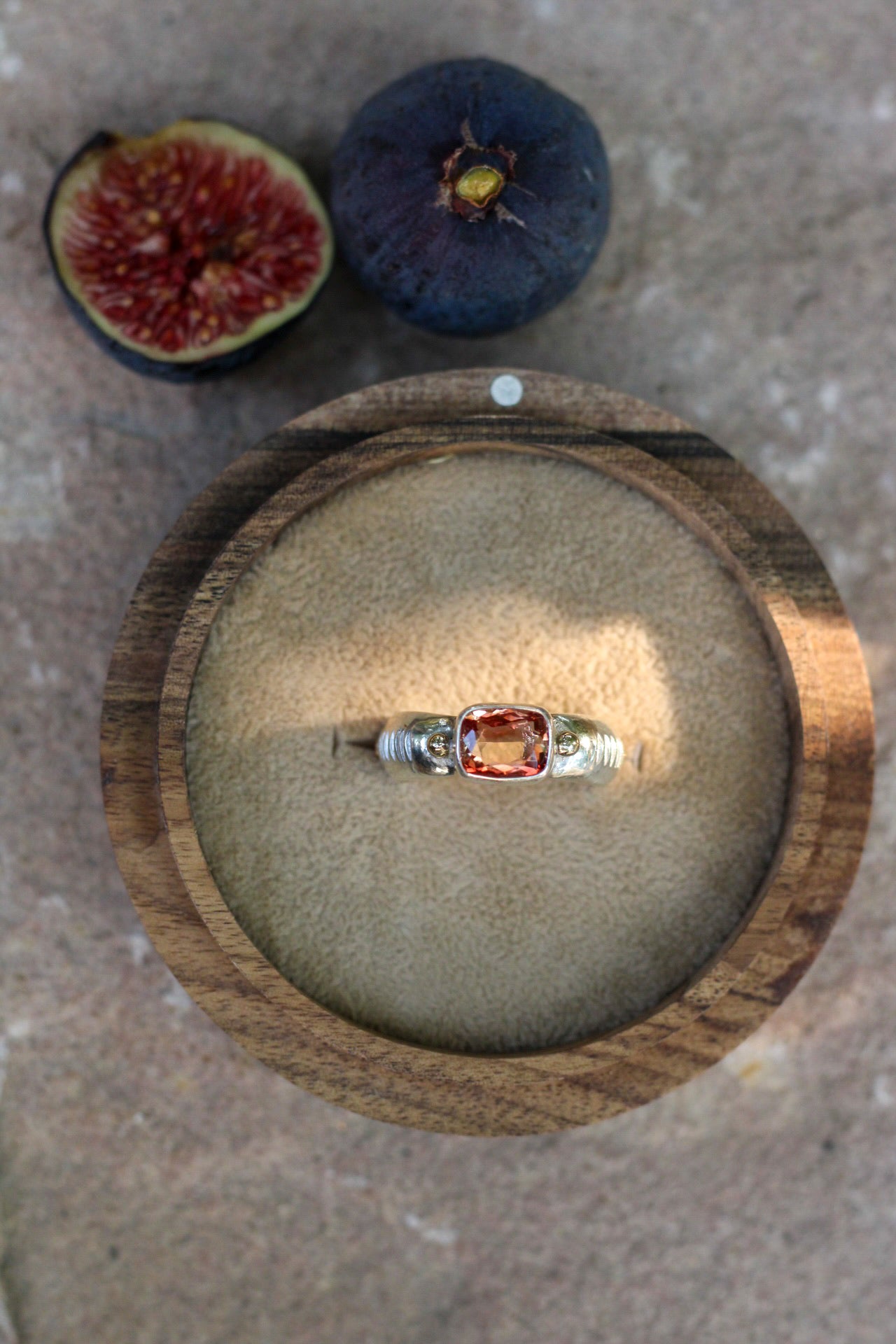 Embrace the magic of Oregon’s sunstone, glowing like a glass of rose. This ring features a hand-stamped band beautifully adorned with 10 karat gold.
