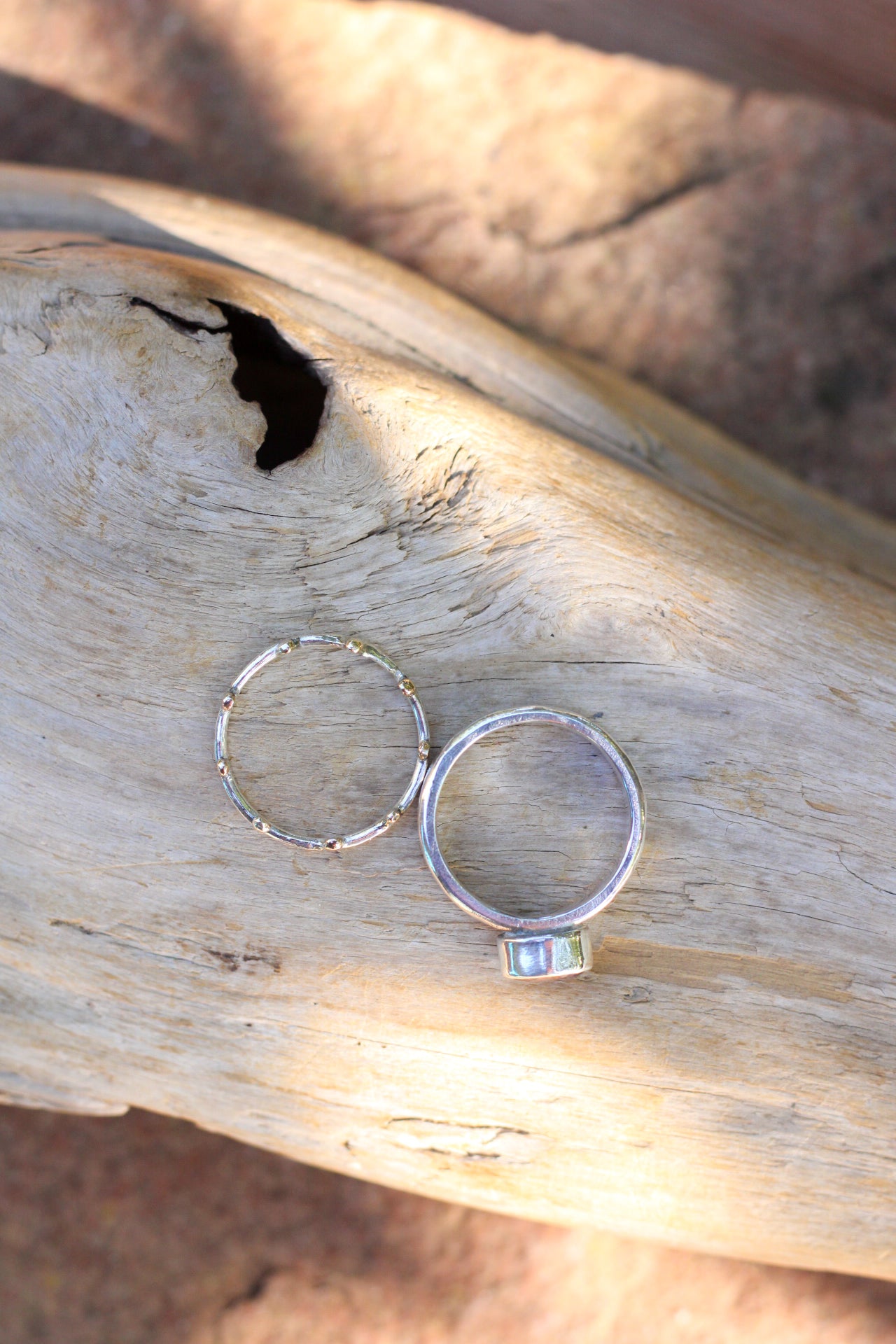 This enchanting set includes a faceted tourmaline ring shimmering in pinks, browns, and purples, perfectly crowned on a thick hammered band. Paired with a delicate gold-detailed stacker, these rings can be worn solo or layered together, creating a regal aura fit for a queen or king.