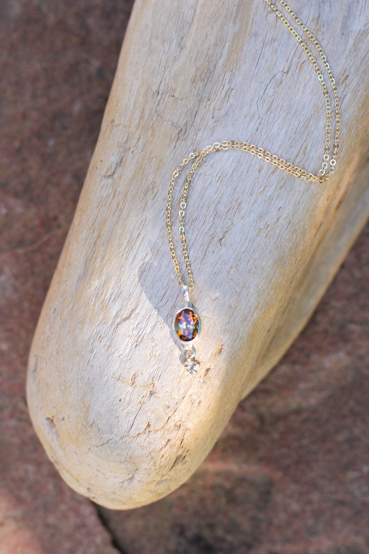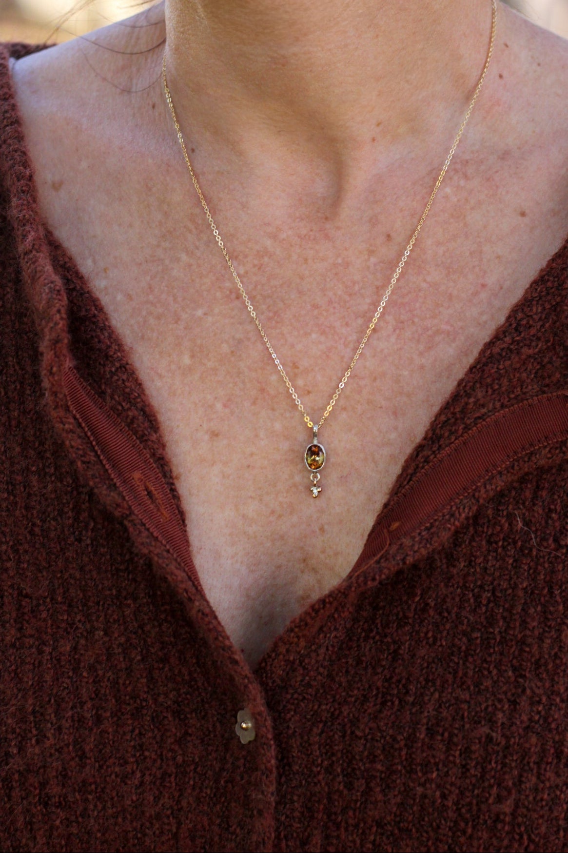 Embrace the warm, rich hues of this Tourmaline Trinity Necklace, showcasing golden browns and sunny yellows that complement any outfit. A delicate 10 karat gold Trinity dangle sways gently below, adding a graceful, magical touch to this versatile piece.